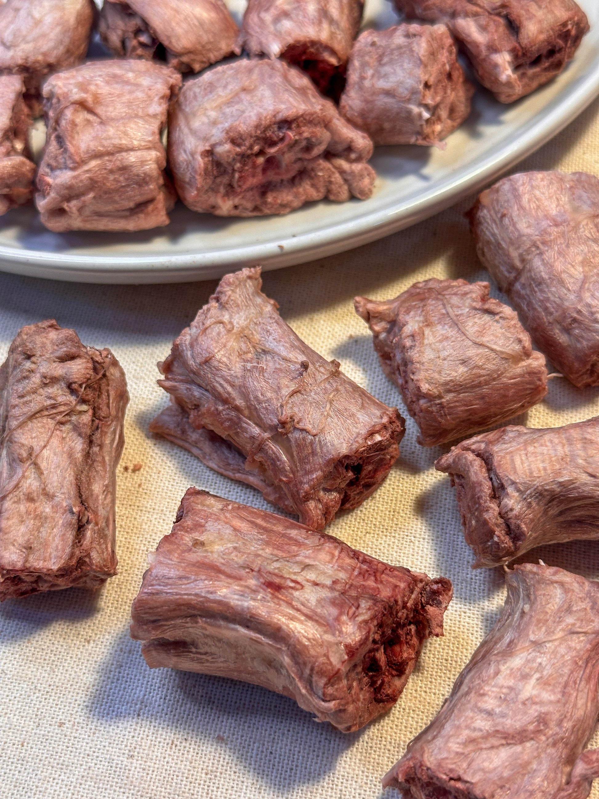 Freeze dried duck necks are a single-ingredient, nutrient-rich treat, naturally high in protein, glucosamine, and chondroitin to support muscle development, joint health, and overall vitality. Their crunchy texture helps promote dental health by gently cleaning teeth and massaging gums as pets chew. Packed with flavor and easily digestible, duck necks make a wholesome, nutrient-dense addition to any pet’s diet.